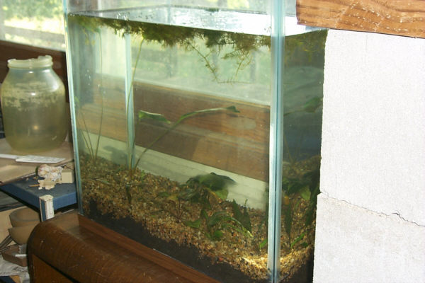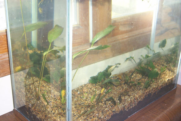 I decided to try out a natural plant tank for the rooted plants that were not doing well in the 135-gallon tank. In that tank there is not much light, but more particularly the leaves were being eaten in scalloped shapes. The 20-gallon tank is a "high", meaning it has the footprint of a 10-gallon tank. It is leftover from when I was living in a dorm room almost 30 years ago and I needed another tank to put on the stand that I already had for my 10-gallon tank. It really isn't much good for fish because of the small surface area to gallons ratio. I followed Diana Walstad's recipe for substrate, with between 1" and 2" of garden soil covered by an equal amount of small gravel. Into this I planted the four Anubius and what was left of the Cryptocorynes. I also added the pitifully small remnant of the hornwort. After two days time the water is clear. I still need to locate the top and light in my mess. Diana Walstad's method calls for small fish to live in a natural planted tank. I do not yet know if I will do this as I already have enough fish to care for. Whatever fish I place in the tank, if I do so, will have to be carnivorous, non-burrowing, and be able to live in an unheated tank.