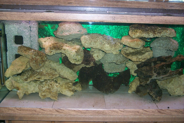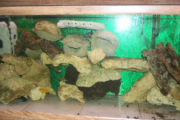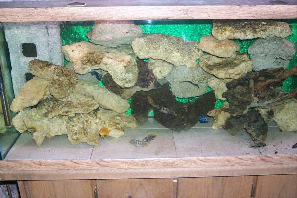 This was my first try at building the reef in my 75-gallon, for African Rift Lake cichlids. Feedback from a forum online convinced me that I had too much rock in the tank, so I rebuilt the reef from the bottom up.