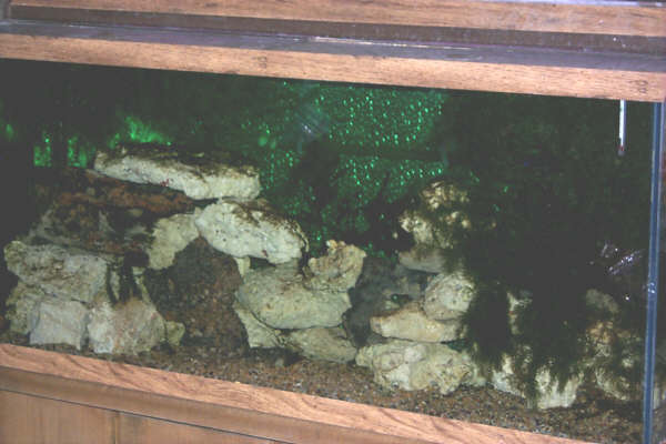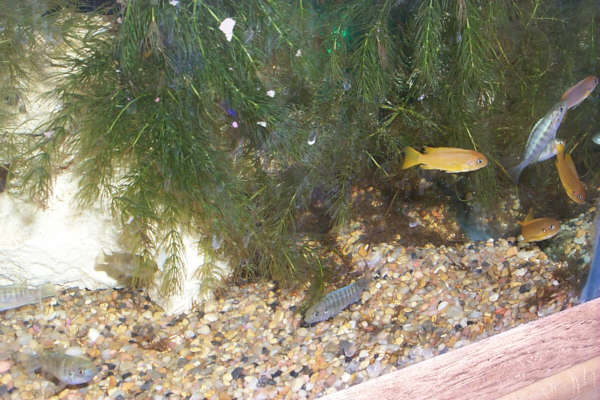 Here you can see that the luxuriant growth of hornwort shown above had been decimated. I do not know what the problem was, but the hornwort that I bought mail order just kept dying off. There was a small amount of growth but nothing like what I recall from my childhood tanks. I finally removed it entirely from this tank, and eventually relegated it completely to my new 20-gallon-high plant tank because I got tired of picking the dead leaves off the filter intakes every morning. The flower pots were added to provide shelter for holding females, or for the Synodontis, but the only thing that used them were snails who laid eggs inside them in record quantities. I removed the pots after a month. A bout of hexamita carried off two of my Labeotropheus before I located the proper medication. I netted them out and cared for them as best I could while trying to acquire the medicine, but they died anyway.