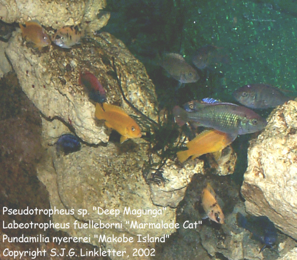 The Pundamilia nyererei began breeding, and one was killed. I thought this was probably a subdominant male, but the man who sold them to me said it was probably an egg-bound female. The death was very sudden, and there were no marks on the body. Of the remaining four "females", three have laid eggs but only one has done so with the dominant male. Two others have spawned with other females and one or both has eaten the eggs. The fourth may actually be another male but if so he does not perform as such. These fish were incredibly territorial in the 75-gallon tank. At the worst point the dominant Pundamilia male held three-quarters of the four-foot tank in conjunction with one of the Ps. sp. "Deep Magunga" males, and the remaining 13 fish lived in the other one-quarter of the tank. After I removed them the tank once again became evenly populated. I conclude that Lake Victoria haps are not temperamentally suited to sharing a tank with Lake Malawi mbuna. Oddly enough, in the 135-gallon tank to which I moved them the Pundamilia now spend a lot of time virtually schooling when previously they had all fought each other for territory. Evidentially all parties were dissatisfied with the previous arrangement.