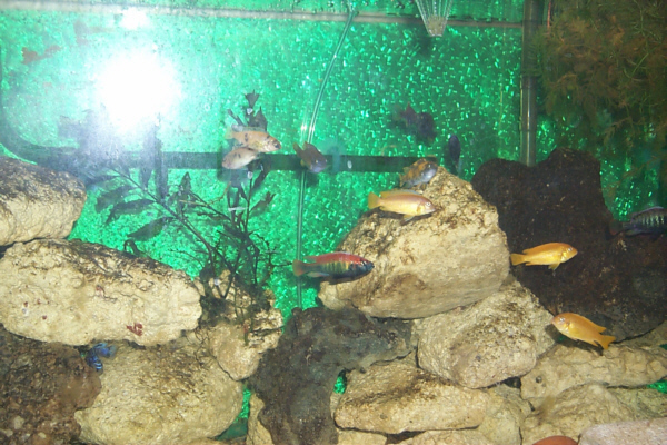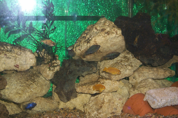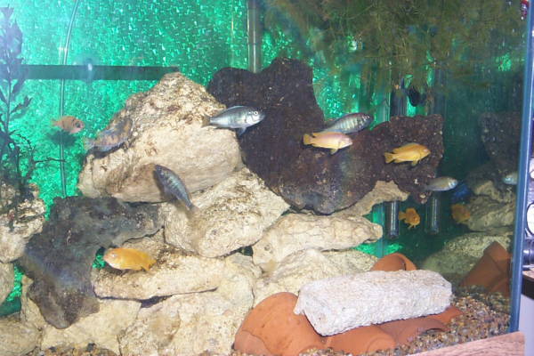 Eventually I decided against three species of mbuna and opted for one haplochromine from Lake Victoria with two mbuna from Lake Malawi. I finished equipping and decorating the tank. The plants are mostly hornwort, with a few African ferns.