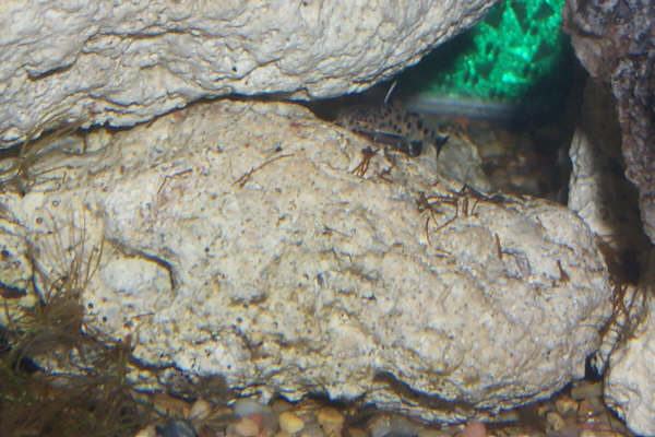 The male dug a spawning pit in the gravel, and I was concerned that my plan to convert the bottom to ceramic tile might put him off his stride. Not a chance. In June the larger female was holding again. (The earlier batch vanished during a tank rearrangement.)